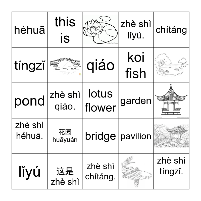 This bingo card has 6 images, a free space and 18 words: 花园 huāyuán, 这是 zhè shì, qiáo, lǐyú, chítáng, héhuā, tíngzǐ, this is, garden, bridge, koi fish, pond, pavilion, zhè shì qiáo., zhè shì tíngzǐ., zhè shì héhuā., zhè shì lǐyú. and zhè shì chítáng..