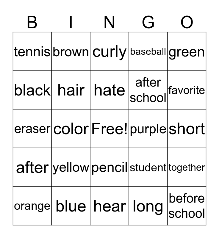 This bingo card has a free space and 24 words: yellow, blue, hate, orange, green, tennis, black, brown, purple, pencil, after school, eraser, student, together, hair, long, short, curly, favorite, color, before school, after, baseball and hear.