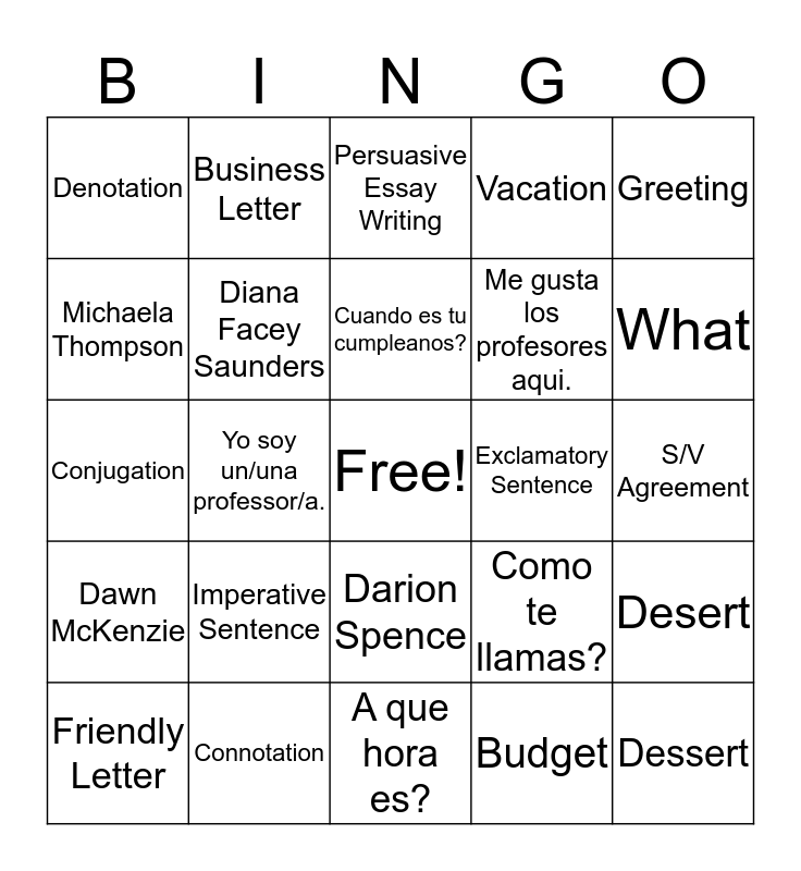 This bingo card has a free space and 24 words: Imperative Sentence, Connotation, Cuando es tu cumpleanos?, Friendly Letter, Greeting, Denotation, Michaela Thompson, Business Letter, Exclamatory Sentence, Darion Spence, Me gusta los profesores aqui., Conjugation, Como te llamas?, Desert, Diana Facey Saunders, Budget, S/V Agreement, Persuasive Essay Writing, What, Yo soy un/una professor/a., Dessert, Dawn McKenzie, Vacation and A que hora es?.