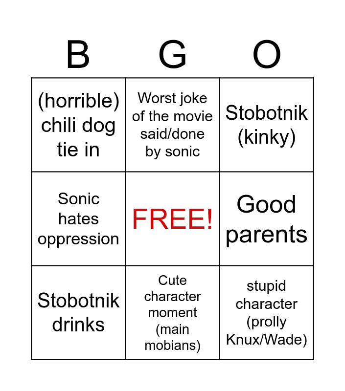 This bingo card has a free space and 8 words: Good parents, Stobotnik (kinky), Worst joke of the movie said/done by sonic, Stobotnik drinks, (horrible) chili dog tie in, stupid character (prolly Knux/Wade), Sonic hates oppression and Cute character moment (main mobians).