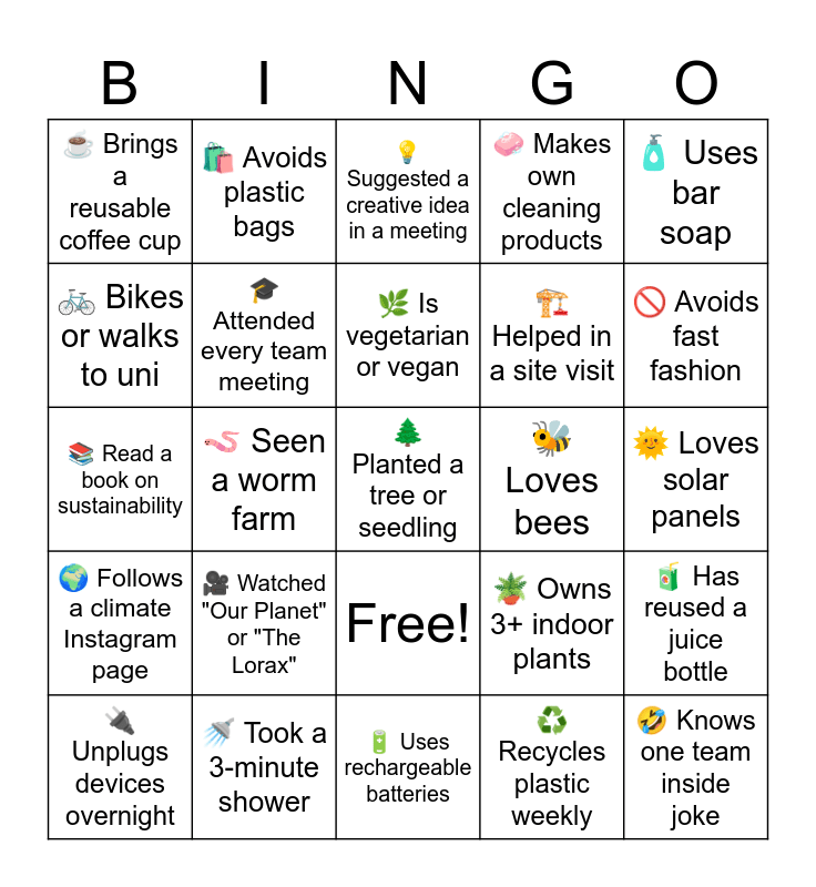 This bingo card has 26 words: Free!, โป๏ธ Recycles plastic weekly, ๐ฟ Is vegetarian or vegan, ๐ฟ Took a 3-minute shower, ๐งด Uses bar soap, โ Brings a reusable coffee cup, ๐ฒ Bikes or walks to uni, ๐๏ธ Avoids plastic bags, ๐ Loves solar panels, ๐ชด Owns 3+ indoor plants, ๐๏ธ Helped in a site visit, ๐ Read a book on sustainability, ๐ง Has reused a juice bottle, ๐ Unplugs devices overnight, ๐ชฑ Seen a worm farm, ๐ง Remembers our project vision, ๐งผ Makes own cleaning products, ๐ Follows a climate Instagram page, ๐ก Suggested a creative idea in a meeting, ๐ฒ Planted a tree or seedling, ๐ซ Avoids fast fashion, ๐ Uses rechargeable batteries, ๐ Loves bees, ๐ฅ Watched "Our Planet" or "The Lorax", ๐ Attended every team meeting and ๐คฃ Knows one team inside joke.