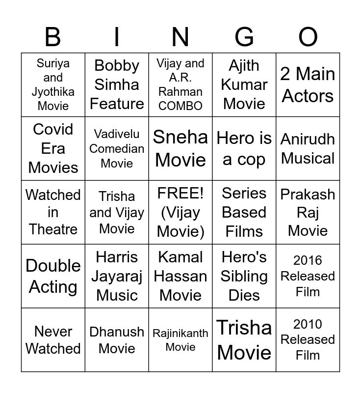 This bingo card has a free space and 24 words: Harris Jayaraj Music, Dhanush Movie, Sneha Movie, Never Watched, 2 Main Actors, Suriya and Jyothika Movie, Covid Era Movies, Bobby Simha Feature, Series Based Films, Kamal Hassan Movie, Hero is a cop, Watched in Theatre, Hero's Sibling Dies, 2016 Released Film, Vadivelu Comedian Movie, Trisha Movie, Prakash Raj Movie, Vijay and A.R. Rahman COMBO, Anirudh Musical, Trisha and Vijay Movie, 2010 Released Film, Double Acting, Ajith Kumar Movie and Rajinikanth Movie.
