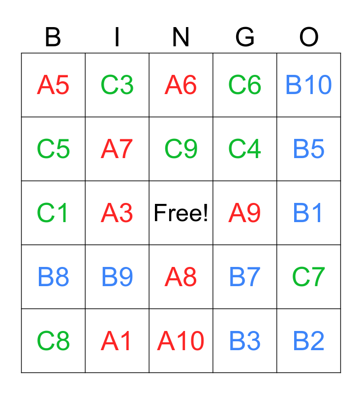 This bingo card has a free space and 30 words: A1, A2, A3, A4, A5, A6, A7, A8, A9, A10, B1, B2, B3, B4, B5, B6, B7, B8, B9, B10, C1, C2, C3, C4, C5, C6, C7, C8, C9 and C10.