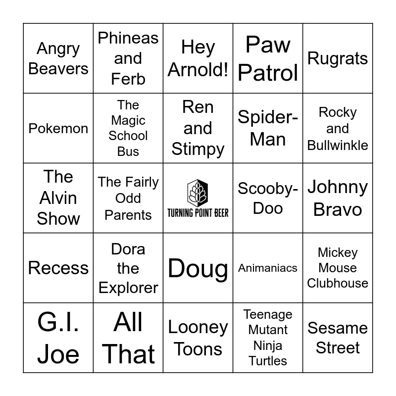 This bingo card has a free space and 50 words: Fraggle Rock, Sesame Street, Spongebob Squarepants, Looney Toons, Dora the Explorer, Kim Possible, Phineas and Ferb, My Little Pony, Pokemon, Thomas the Tank Engine & Friends, The Magic School Bus, Paw Patrol, Mickey Mouse Clubhouse, Animaniacs, DuckTales, Inspector Gadget, Ren and Stimpy, Scooby-Doo, Pink Panther, Rugrats, The Fairly Odd Parents, Teenage Mutant Ninja Turtles, Angry Beavers, Spider-Man, Mr. Rogers' Neighborhood, The Flinstones, Rocky and Bullwinkle, Mighty Morphin Power Rangers, Hey Arnold!, Doug, The Adventures of Pete and Pete, Aaahh!!! Real Monsters, Rocket Power, Reading Rainbow, All That, Barney, Goosebumps, Pinky and the Brain, The Wild Thornberrys, Johnny Bravo, Rocko's Modern Life, The Jetsons, Freakazoid, Thundercats, G.I. Joe, The Alvin Show, Underdog, Peppa Pig, Recess and The Smurfs.