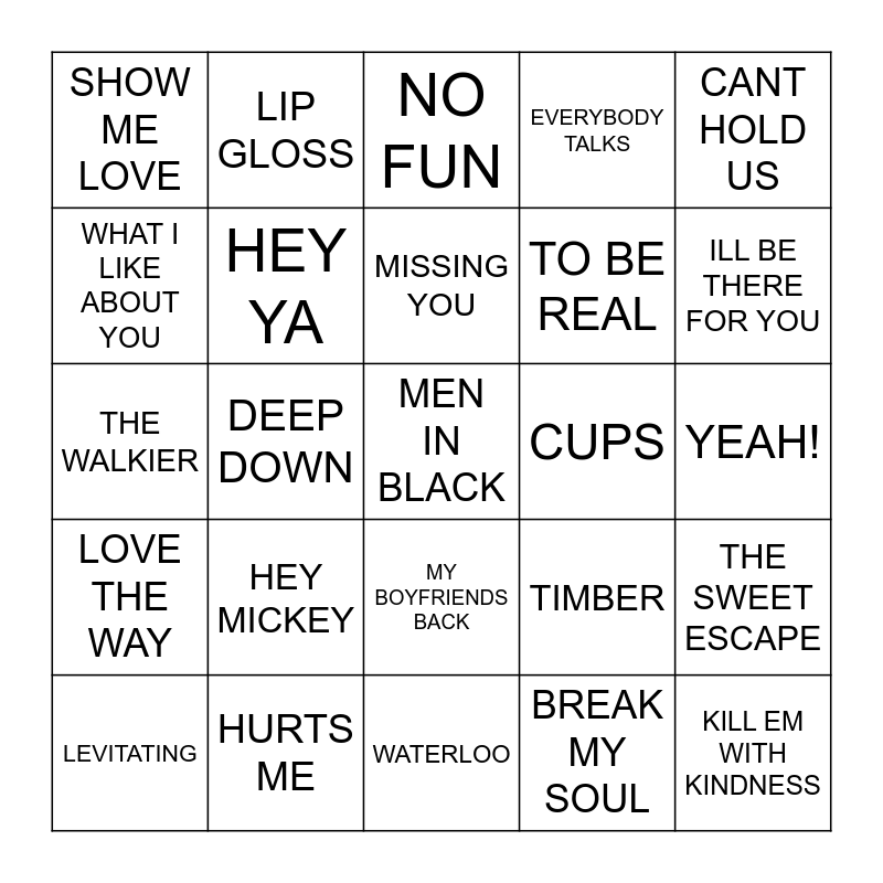 This bingo card has 50 words: FORGET ME NOTS, MEN IN BLACK, COULD HAVE BEEN ME, WATERLOO, HEY MICKEY, MEET ME HALFWAY, LIP GLOSS, MAMBO NO 5, WHAT I LIKE ABOUT YOU, SHAKE IT OFF, HEY YA, EVERYBODY TALKS, THE SWEET ESCAPE, TIMBER, BACK TO LIFE, ANIMAL, MISSING YOU, CUPS, ONE MORE TIME, CANT HOLD US, DEEP DOWN, BREAK MY SOUL, SHOW ME LOVE, TO BE REAL, GOT TO BE REAL, KILL EM WITH KINDNESS, ILL BE THERE FOR YOU, WE WILL ROCK YOU, NO FUN, MY BOYFRIENDS BACK, ONLY THE GOOD DIE YOUNG, ANOTHER ONE BITES THE DUST, DROGBA, WALKING ON A DREAM, HURTS ME, AINT NOBODY, MANY TIMES, RIDE IT, DYNAMITE, YEAH!, MAKE IT CLAP, NOLIA CLAP, STACYS'S MOM, DANCE THE NIGHT, LEVITATING, THE WALKIER, HANDCLAP, APPLAUSE, LOVE THE WAY and SHOOP SHOOP SONG.