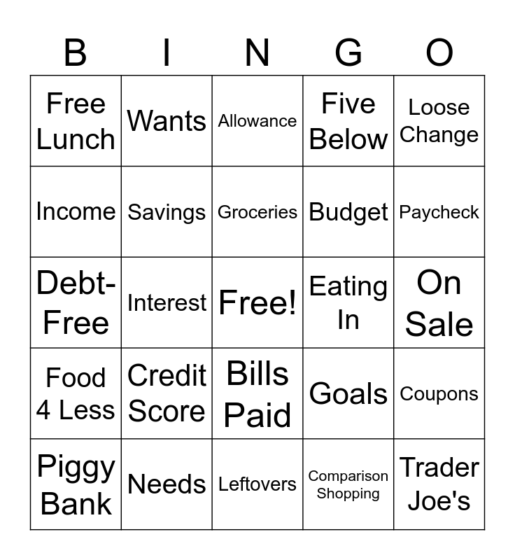 This bingo card has a free space and 24 words: Credit Score, Needs, Groceries, Piggy Bank, Loose Change, Free Lunch, Income, Wants, Eating In, Bills Paid, Budget, Debt-Free, Goals, Coupons, Savings, Comparison Shopping, On Sale, Allowance, Paycheck, Interest, Trader Joe's, Food 4 Less, Five Below and Leftovers.