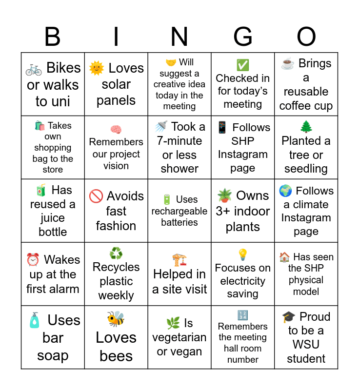 This bingo card has 25 words: β»οΈ Recycles plastic weekly, πΏ Is vegetarian or vegan, πΏ Took a 7-minute or less shower, π§΄ Uses bar soap, β Brings a reusable coffee cup, π² Bikes or walks to uni, ποΈ Takes own shopping bag to the store, π Loves solar panels, πͺ΄ Owns 3+ indoor plants, ποΈ Helped in a site visit, π± Follows SHP Instagram page, π§ Has reused a juice bottle, π‘ Focuses on electricity saving, π Has seen the SHP physical model, π§ Remembers our project vision, π Proud to be a WSU student, π Follows a climate Instagram page, π€ Will suggest a creative idea today in the meeting, π² Planted a tree or seedling, π« Avoids fast fashion, π Uses rechargeable batteries, π Loves bees, β° Wakes up at the first alarm, β Checked in for todayβs meeting and π’ Remembers the meeting hall room number.