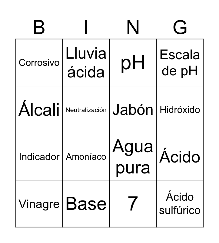 This bingo card has 20 words: Ácido, Ácido clorhídrico, pH, Bicarbonato, Vinagre, Álcali, Base, Corrosivo, Indicador, Lluvia ácida, Amoníaco, Agua pura, Neutralización, Ácido sulfúrico, Jabón, Sal, Hidróxido, Escala de pH, 7 and Lavanda.