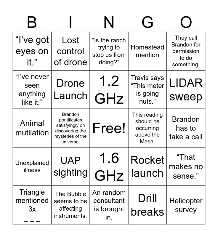 This bingo card has a free space and 24 words: UAP sighting, The Bubble seems to be affecting instruments., 1.2 GHz, Triangle mentioned 3x _ _ _, They call Brandon for permission to do something., “I’ve got eyes on it.”, “I’ve never seen anything like it.”, Lost control of drone, This reading should be occurring above the Mesa., 1.6 GHz, Travis says “This meter is going nuts.”, Animal mutilation, Rocket launch, “That makes no sense.”, Drone Launch, Drill breaks, Brandon has to take a call, “Is the ranch trying to stop us from doing?”, LIDAR sweep, Brandon pontificates satisfyingly on discovering the mysteries of the universe., Helicopter survey, Unexplained illness, Homestead mention and An random consultant is brought in..
