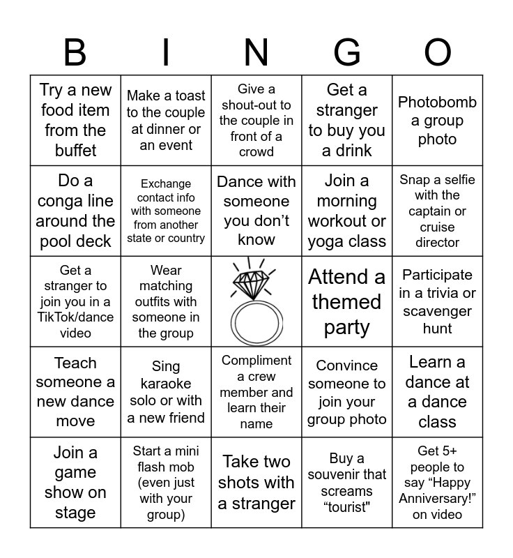 This bingo card has a free space and 25 words: Sing karaoke solo or with a new friend, Take two shots with a stranger, Dance with someone you don’t know, Join a game show on stage, Photobomb a group photo, Try a new food item from the buffet, Do a conga line around the pool deck, Make a toast to the couple at dinner or an event, Attend a themed party, Compliment a crew member and learn their name, Join a morning workout or yoga class, Get a stranger to join you in a TikTok/dance video, Convince someone to join your group photo, Learn a dance at a dance class, Exchange contact info with someone from another state or country, Recreate a romantic scene from a movie on deck, Participate in a trivia or scavenger hunt, Give a shout-out to the couple in front of a crowd, Snap a selfie with the captain or cruise director, Wear matching outfits with someone in the group, Get 5+ people to say “Happy Anniversary!” on video, Start a mini flash mob (even just with your group), Teach someone a new dance move, Get a stranger to buy you a drink and Buy a souvenir that screams “tourist".