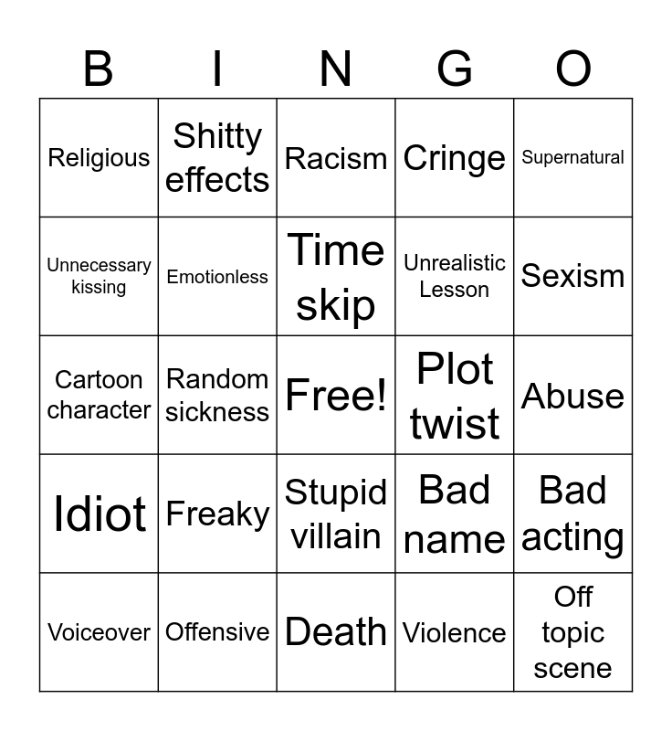 This bingo card has a free space and 24 words: Freaky, Offensive, Time skip, Voiceover, Supernatural, Religious, Unnecessary kissing, Shitty effects, Plot twist, Stupid villain, Unrealistic Lesson, Cartoon character, Bad name, Bad acting, Emotionless, Violence, Abuse, Racism, Sexism, Random sickness, Off topic scene, Idiot, Cringe and Death.