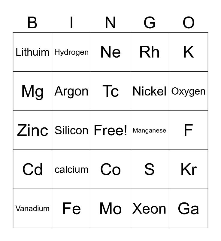 This bingo card has a free space and 24 words: calcium, Fe, Tc, Vanadium, K, Lithuim, Mg, Hydrogen, Manganese, Co, Nickel, Zinc, S, Kr, Argon, Xeon, F, Ne, Oxygen, Silicon, Ga, Cd, Rh and Mo.