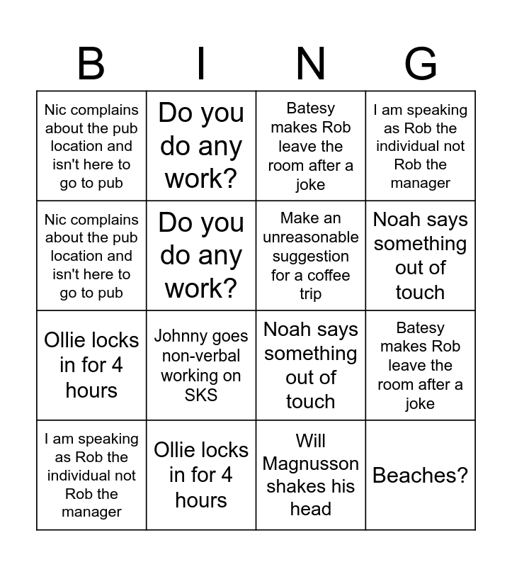 ⚠ This card has duplicate items: He/Him (2), We couldn't, could we? (2), Will Magnusson shakes his head (2), Beaches? (2), Nic complains about the pub location and isn't here to go to pub (2), Do you do any work? (2), Make an unreasonable suggestion for a coffee trip (2), HR joke (2), Ollie locks in for 4 hours (2), Johnny goes non-verbal working on SKS (2), Batesy makes Rob leave the room after a joke (2), I am speaking as Rob the individual not Rob the manager (2), Johnny heads to the stress relief room (2), Noah says something out of touch (2)