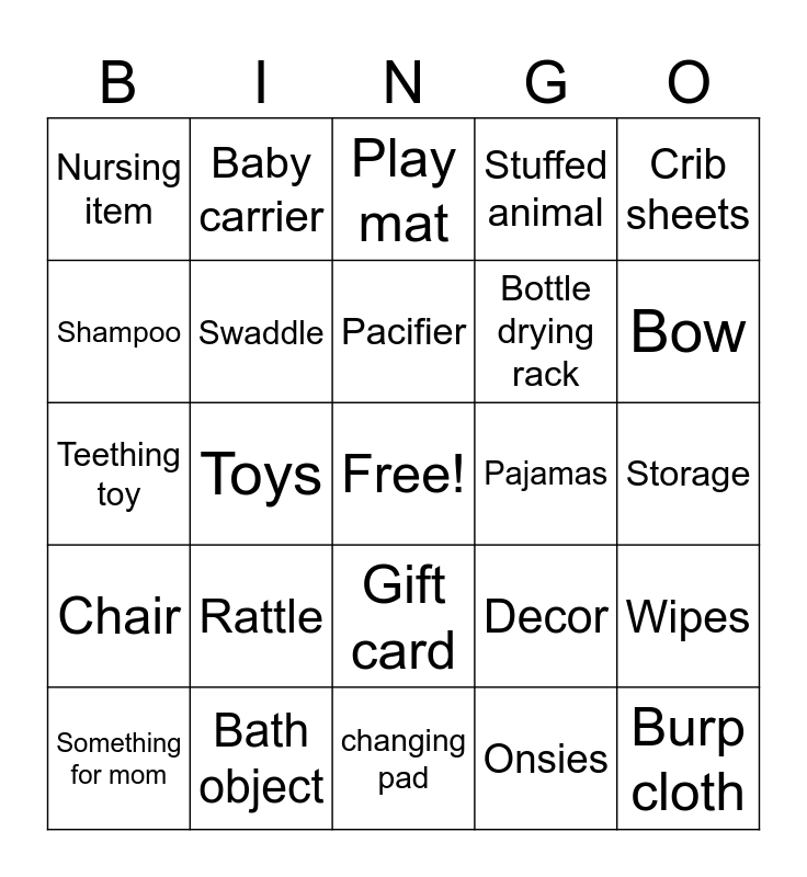 This bingo card has a free space and 32 words: Onsies, Bibs, Toys, Bottles, Chair, Swaddle, Crib sheets, Wipes, Baby carrier, Playpen, Pacifier, Play mat, Monitor, Socks, Pajamas, Blanket, Something for mom, Teething toy, Gift card, Rattle, Decor, Hat, Storage, Bath object, Burp cloth, Stuffed animal, Bottle drying rack, Shampoo, Nursing item, changing pad, Bottle warmer and Bow.