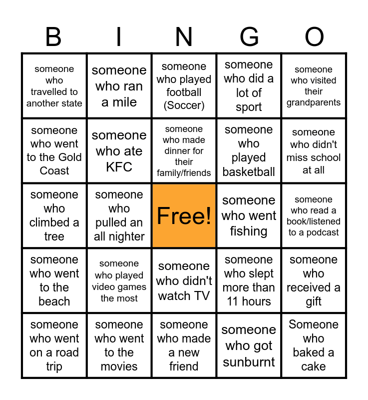This bingo card has a free space and 24 words: someone who played video games the most, someone who went to the movies, someone who made dinner for their family/friends, someone who went on a road trip, someone who visited their grandparents, someone who travelled to another state, someone who went to the Gold Coast, someone who ran a mile, someone who went fishing, someone who didn't watch TV, someone who played basketball, someone who climbed a tree, someone who slept more than 11 hours, someone who received a gift, someone who ate KFC, someone who got sunburnt, someone who read a book/listened to a podcast, someone who played football (Soccer), someone who didn't miss school at all, someone who pulled an all nighter, Someone who baked a cake, someone who went to the beach, someone who did a lot of sport and someone who made a new friend.
