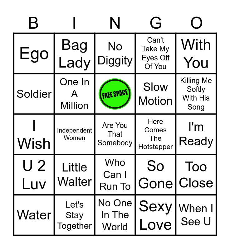 This bingo card has 1 images and 74 words: Poison, Can We Talk, No Diggity, You Make Me Wanna, Hold On, Adorn, It Wasn't Me, Can't Help But Wait, Rock The Boat, Lady Marmalade, When I See U, Remember The Time, Soldier, Boo'd Up, Independent Women, I'm Sprung, Are You That Somebody, I Like, With You, If It Isn't Love, I Wish, One In A Million, Bag Lady, Can't Take My Eyes Off Of You, The Right Kinda Lover, Love's Train, Where The Party At, Must Be Nice, Miss You Much, Shortie Like Mine, Best Of Me, Leave The Door Open, So Gone, Killing Me Softly With His Song, Slow Motion, Needed Me, All For You, I'm Ready, Sexy Love, Be Without You, Bad Boy/Having A Party, That's What I Like, Wall To Wall, Let It Go, Love Of My Life, Water, Ego, I'm A Flirt, When Doves Cry, Kiss, Who Can I Run To, Let's Groove, Cool It Now, My Prerogative, You're The First, The Last, My Everything, Every Little Step, Don't Go, My Lovin' (You're Never Gonna Get It), What You Won't Do For Love, Little Walter, Girl On Fire, Fallin', I Wanna Dance With Somebody, How Will I Know, Here Comes The Hotstepper, Ain't No Sunshine, I'm So Into You, Right Here, Too Close, U 2 Luv, Let's Stay Together, Caught Up In The Rapture, No One In The World and Never Too Much.
