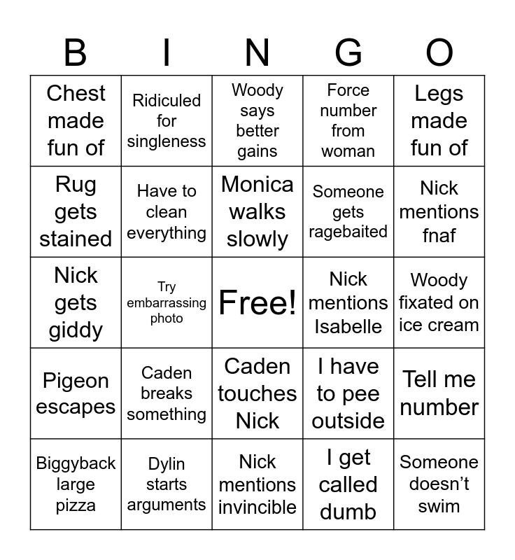 This bingo card has a free space and 24 words: Caden breaks something, Dylin starts arguments, Monica walks slowly, Biggyback large pizza, Legs made fun of, Chest made fun of, Rug gets stained, Ridiculed for singleness, Nick mentions Isabelle, Caden touches Nick, Someone gets ragebaited, Nick gets giddy, I have to pee outside, Tell me number, Have to clean everything, I get called dumb, Woody fixated on ice cream, Woody says better gains, Nick mentions fnaf, Try embarrassing photo, Someone doesn’t swim, Pigeon escapes, Force number from woman and Nick mentions invincible.