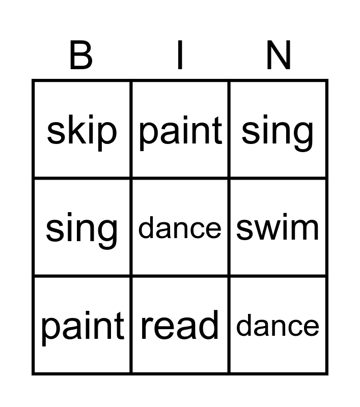 ⚠ This card has duplicate items: swim (2), color (2), sing (2), skip (2), read (2), run (2)