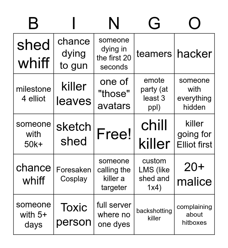This bingo card has a free space and 24 words: Foresaken Cosplay, Toxic person, one of "those" avatars, someone with 5+ days, hacker, shed whiff, milestone 4 elliot, chance dying to gun, chill killer, someone calling the killer a targeter, emote party (at least 3 ppl), someone with 50k+, custom LMS (like shed and 1x4), 20+ malice, killer leaves, backshotting killer, killer going for Elliot first, someone dying in the first 20 seconds, someone with everything hidden, sketch shed, complaining about hitboxes, chance whiff, teamers and full server where no one dyes.