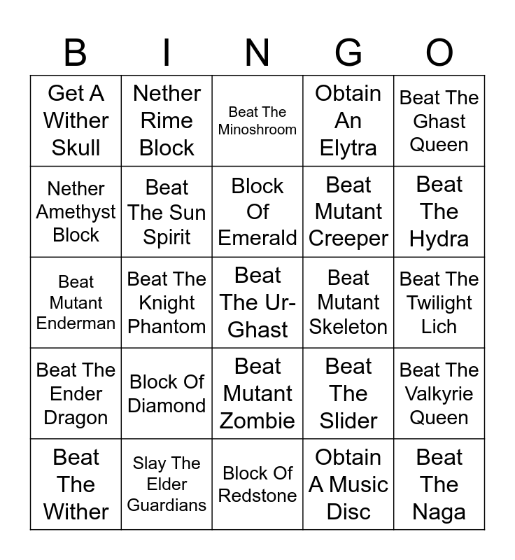 This bingo card has 25 words: Block Of Diamond, Block Of Redstone, Block Of Emerald, Beat The Wither, Beat The Ghast Queen, Get A Wither Skull, Nether Amethyst Block, Nether Rime Block, Beat Mutant Skeleton, Beat Mutant Zombie, Beat Mutant Creeper, Beat Mutant Enderman, Beat The Slider, Beat The Valkyrie Queen, Beat The Sun Spirit, Beat The Naga, Beat The Twilight Lich, Beat The Minoshroom, Beat The Hydra, Beat The Knight Phantom, Beat The Ur-Ghast, Slay The Elder Guardians, Beat The Ender Dragon, Obtain An Elytra and Obtain A Music Disc.