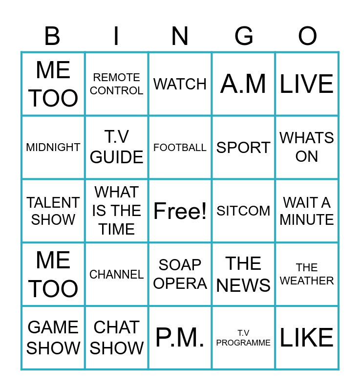 This bingo card has a free space and 24 words: CHANNEL, CHAT SHOW, FOOTBALL, GAME SHOW, LIVE, ME TOO, MIDNIGHT, REMOTE CONTROL, SITCOM, SOAP OPERA, SPORT, TALENT SHOW, THE NEWS, THE WEATHER, T.V GUIDE, T.V PROGRAMME, WAIT A MINUTE, WATCH, WHATS ON, WHAT IS THE TIME, LIKE, ME TOO, A.M and P.M..