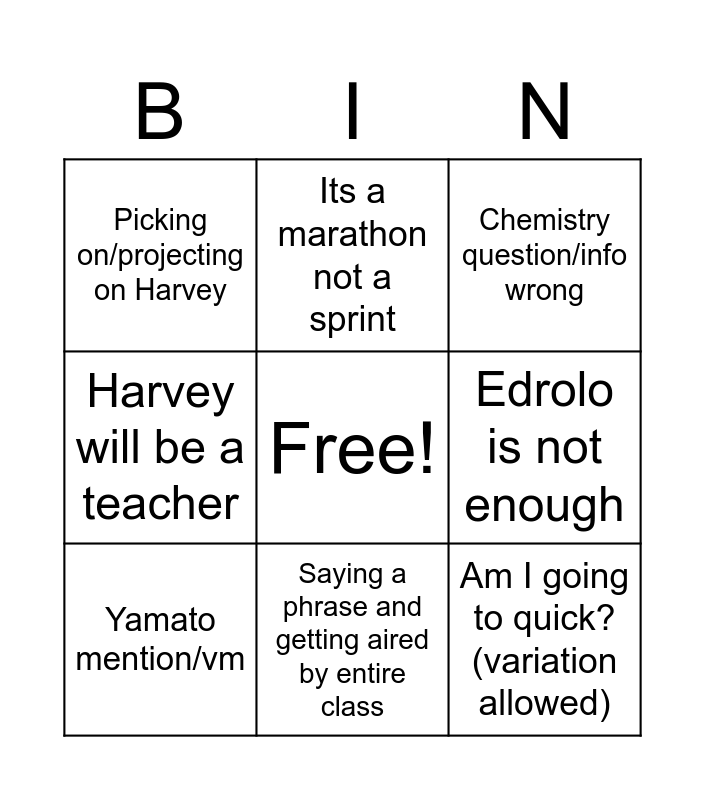 This bingo card has a free space and 22 words: Hoe much/many, Problem Solving Mention, Its a marathon not a sprint, Third person reference, Edrolo is not enough, Yamato mention/vm, Picking on/projecting on Harvey, Chemistry question/info wrong, Sports analogy/referring to class as team, Other science mention, 5 minute tangent before realisation, Harvey will be a teacher, Some pople don’t make it to year 12, We just work harder, Year 9 mention, Sibling mention, Noah chicken shop, Spending 20 minute on one question, Self hatred/self awareness (rare), Am I going to quick? (variation allowed), Saying a phrase and getting aired by entire class and Making class mates pick each other to answer his shitty fuckin questions.