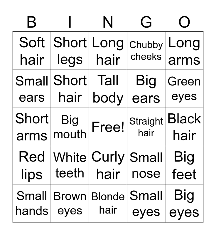 This bingo card has a free space and 30 words: Brown eyes, Red hair, Big mouth, Long fingers, Soft hair, Long hair, Short hair, Curly hair, Straight hair, Blonde hair, Black hair, Big eyes, Small eyes, Blue eyes, Green eyes, Big nose, Small nose, Red lips, White teeth, Long arms, Short arms, Long legs, Short legs, Big ears, Small ears, Chubby cheeks, Big feet, Small hands, Tall body and Short body.