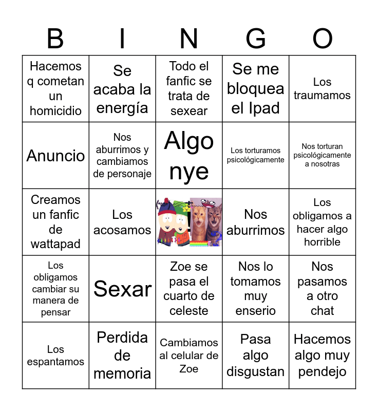 This bingo card has a free space and 24 words: Sexar, Perdida de memoria, Algo nye, Los espantamos, Los traumamos, Hacemos q cometan un homicidio, Anuncio, Se acaba la energía, Nos aburrimos, Zoe se pasa el cuarto de celeste, Los torturamos psicológicamente, Creamos un fanfic de wattapad, Nos lo tomamos muy enserio, Nos pasamos a otro chat, Nos aburrimos y cambiamos de personaje, Pasa algo disgustan, Los obligamos a hacer algo horrible, Todo el fanfic se trata de sexear, Nos torturan psicológicamente a nosotras, Los acosamos, Hacemos algo muy pendejo, Los obligamos cambiar su manera de pensar, Se me bloquea el Ipad and Cambiamos al celular de Zoe.