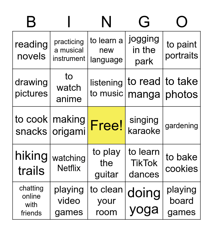 This bingo card has a free space and 24 words: watching Netflix, playing video games, listening to music, chatting online with friends, to paint portraits, reading novels, drawing pictures, practicing a musical instrument, singing karaoke, to play the guitar, to read manga, to cook snacks, to learn TikTok dances, to bake cookies, to watch anime, doing yoga, gardening, to learn a new language, to take photos, making origami, playing board games, hiking trails, jogging in the park and to clean your room.