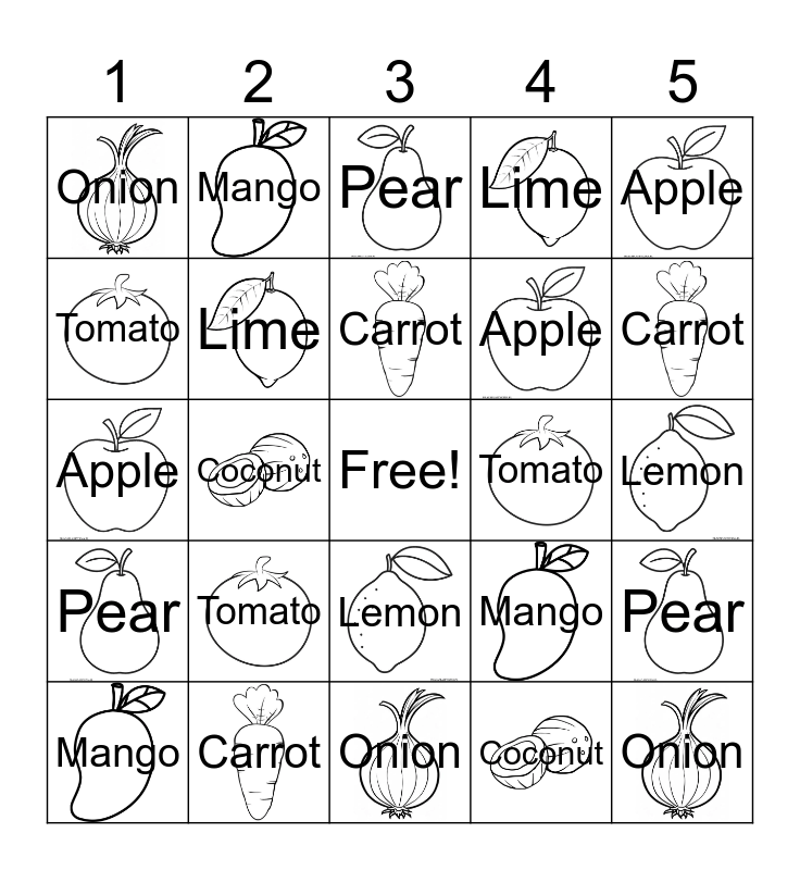 This bingo card has 24 images, a free space and 24 words: Mango, Tomato, Carrot, Coconut, Apple, Onion, Mango, Pear, Tomato, Lemon, Apple, Lime, Mango, Pear, Tomato, Carrot, Onion, Lime, Carrot, Pear, Coconut, Lemon, Apple and Onion.