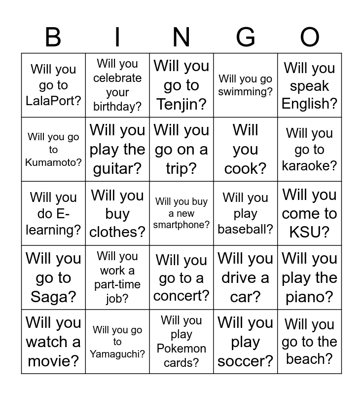 This bingo card has 25 words: Will you work a part-time job?, Will you play Pokemon cards?, Will you go on a trip?, Will you watch a movie?, Will you speak English?, Will you go to LalaPort?, Will you go to Kumamoto?, Will you celebrate your birthday?, Will you play baseball?, Will you go to a concert?, Will you cook?, Will you do E-learning?, Will you drive a car?, Will you play the piano?, Will you play the guitar?, Will you go to the beach?, Will you come to KSU?, Will you go to Tenjin?, Will you go to karaoke?, Will you buy clothes?, Will you buy a new smartphone?, Will you go to Yamaguchi?, Will you go to Saga?, Will you go swimming? and Will you play soccer?.