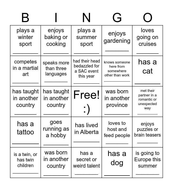 This bingo card has a free space and 29 words: is a twin, or has twin children __________, speaks Greek ______, has taught in another country ________, plays a musical instrument ________, plays a winter sport ________, plays a summer sport ________, speaks more than three languages _________, goes running as a hobby ________, was born in another province ________, was born in another country ________, met their partner in a romantic or unexpected way __________, is going to Europe this summer ________, has a secret or weird talent ________, has a dog ______, has a cat ______, is a grandparent ________, has lived in Alberta ________, has a tattoo _______, loves going on cruises _______, has taught in another country _______, loves to host and feed people ________, has visited, or will visit Northern Canada _________, knows someone here from somewhere other than work _____________, competes in a martial art _________, enjoys gardening _______, enjoys baking or cooking ________, enjoys puzzles or brain teasers ________, had their head bedazzled for a SAC event this year ___________ and coached a Vanier team for the first time this year ___________.