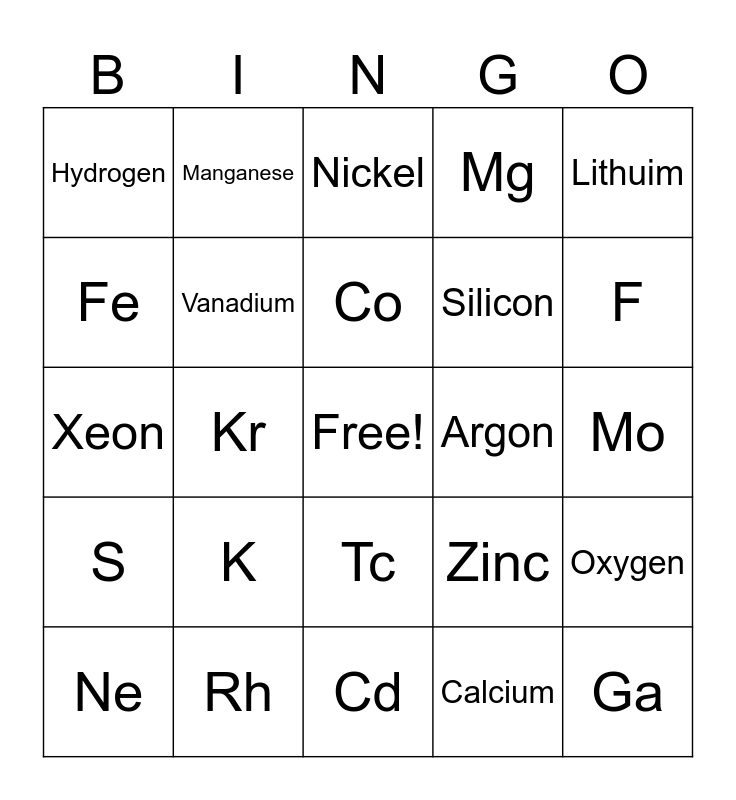This bingo card has a free space and 24 words: Ne, K, Co, Calcium, Lithuim, Hydrogen, Manganese, Nickel, Argon, Mo, Xeon, Vanadium, Zinc, Oxygen, Fe, Rh, Cd, Mg, F, S, Kr, Tc, Silicon and Ga.