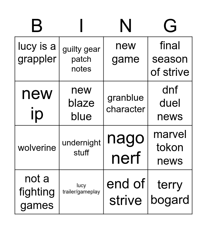 This bingo card has 16 words: lucy trailer/gameplay, marvel tokon news, new game, lucy is a grappler, wolverine, guilty gear patch notes, nago nerf, end of strive, new ip, new blaze blue, not a fighting games, final season of strive, undernight stuff, dnf duel news, granblue character and terry bogard.