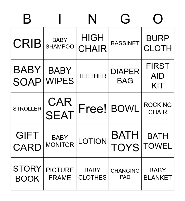 This bingo card has a free space and 50 words: ACTIVITY MAT, BABY BLANKET, BABY CARRIER, BABY CLOTHES, BABY MONITOR, BABY POWDER, BABY SHAMPOO, BABY SHOES, BABY SOAP, BABY SPOON, BABY WIPES, BASSINET, BATH TOWEL, BATH TOYS, BATHTUB, BIB, TEETHER, BOWL, BOTTLE BRUSH, BURP CLOTH, CAR SEAT, CHANGING PAD, CRIB, DIAPER BAG, DIAPER CREAM, DIAPERS, FIRST AID KIT, HAT, HIGH CHAIR, LOTION, BOTTLE DRYING RACK, NIGHT LIGHT, ONESIE, PACIFIER, PICTURE FRAME, BOTTLE WARMER, PILLOW, PLATE, RATTLE, ROCKING CHAIR, BABY BOTTLE, SLEEP SACK, SLEEPER, SOCKS, STORY BOOK, STROLLER, STUFFED ANIMAL, MITTENS, GIFT CARD and NASAL ASPIRATOR.