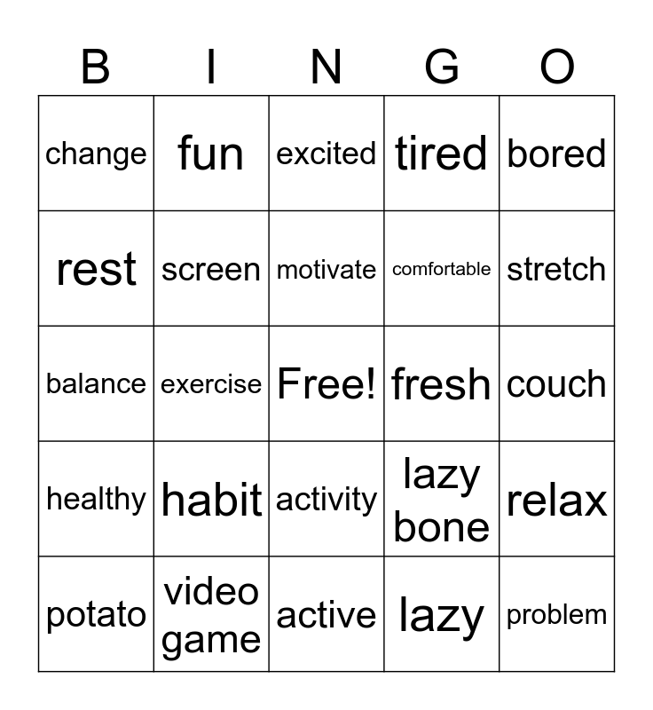 This bingo card has a free space and 24 words: habit, video game, motivate, potato, bored, change, rest, fun, fresh, activity, comfortable, balance, lazy bone, relax, screen, lazy, couch, excited, stretch, exercise, problem, healthy, tired and active.