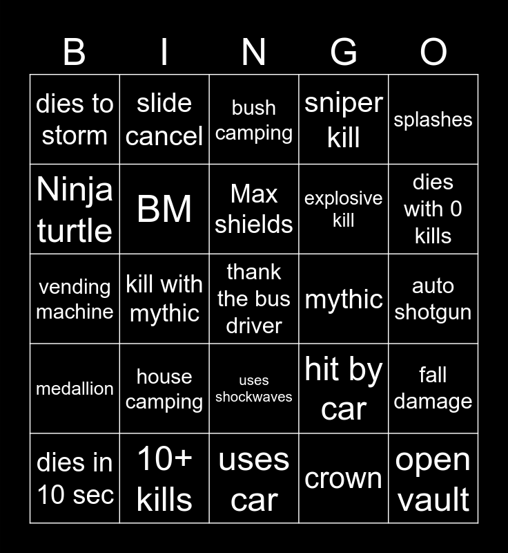 This bingo card has a free space and 24 words: house camping, 10+ kills, Max shields, dies in 10 sec, splashes, dies to storm, Ninja turtle, slide cancel, mythic, uses shockwaves, explosive kill, vending machine, hit by car, fall damage, BM, crown, auto shotgun, bush camping, dies with 0 kills, kill with mythic, open vault, medallion, sniper kill and uses car.