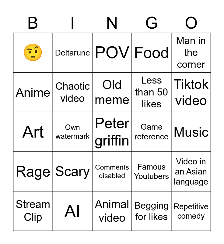 This bingo card has a free space and 24 words: Scary, AI, Old meme, Stream Clip, Man in the corner, 🤨, Anime, Deltarune, Game reference, Comments disabled, Less than 50 likes, Art, Famous Youtubers, Video in an Asian language, Chaotic video, Begging for likes, Music, POV, Tiktok video, Own watermark, Repetitive comedy, Rage, Food and Animal video.
