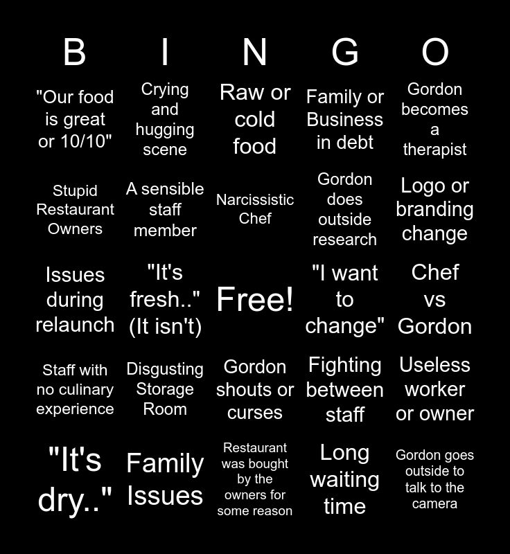 This bingo card has a free space and 24 words: Disgusting Storage Room, Family Issues, Narcissistic Chef, "It's dry..", Gordon becomes a therapist, "Our food is great or 10/10", Stupid Restaurant Owners, Crying and hugging scene, "I want to change", Gordon shouts or curses, Gordon does outside research, Issues during relaunch, Fighting between staff, Useless worker or owner, A sensible staff member, Long waiting time, Chef vs Gordon, Raw or cold food, Logo or branding change, "It's fresh.." (It isn't), Gordon goes outside to talk to the camera, Staff with no culinary experience, Family or Business in debt and Restaurant was bought by the owners for some reason.