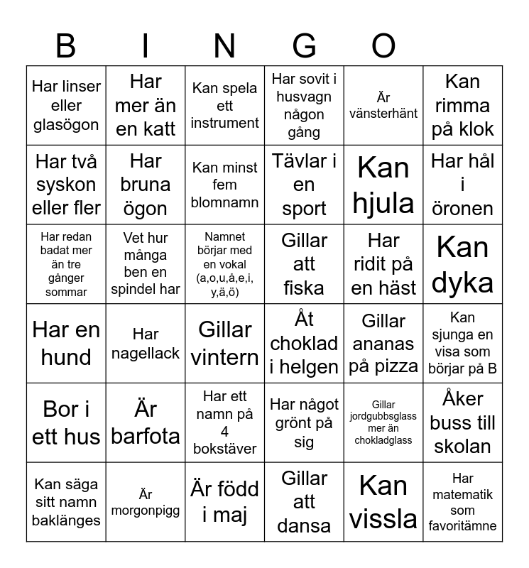 This bingo card has 36 words: Har något grönt på sig, Har ett namn på 4 bokstäver, Gillar att dansa, Har två syskon eller fler, Har en hund, Gillar att fiska, Har bruna ögon, Är född i maj, Är vänsterhänt, Gillar jordgubbsglass mer än chokladglass, Har hål i öronen, Har sovit i husvagn någon gång, Åker buss till skolan, Vet hur många ben en spindel har, Tävlar i en sport, Har linser eller glasögon, Bor i ett hus, Har ridit på en häst, Har redan badat mer än tre gånger sommar, Kan spela ett instrument, Namnet börjar med en vokal (a,o,u,å,e,i, y,ä,ö), Har nagellack, Åt choklad i helgen, Gillar vintern, Gillar ananas på pizza, Har mer än en katt, Kan hjula, Är morgonpigg, Kan minst fem blomnamn, Kan rimma på klok, Har matematik som favoritämne, Kan säga sitt namn baklänges, Kan sjunga en visa som börjar på B, Kan dyka, Är barfota and Kan vissla.