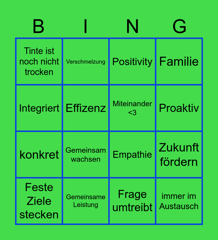 This bingo card has 16 words: Gemeinsame Leistung, Zukunft fördern, Positivity, Tinte ist noch nicht trocken, konkret, Verschmelzung, Empathie, Frage umtreibt, Integriert, Effizenz, Feste Ziele stecken, Familie, Gemeinsam wachsen, Proaktiv, Miteinander <3 and immer im Austausch.