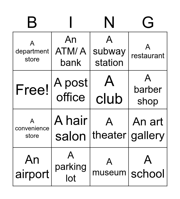 This bingo card has 16 words: A parking lot, An art gallery, A subway station, A department store, A convenience store, An ATM/ A bank, A theater, A museum, Free!, A post office, An airport, A restaurant, A hair salon, A barber shop, A club and A school.