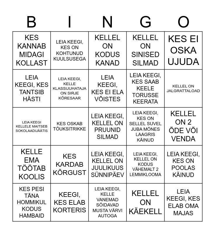 This bingo card has 25 words: KES KARDAB KÕRGUST, LEIA KEEGI, KELLE VANEMAD SÕIDAVAD MUSTA VÄRVI AUTOGA, LEIA KEEGI, KES EI ELA VÕISTES, KES PESI TÄNA HOMMIKUL KODUS HAMBAID, KES EI OSKA UJUDA, KES KANNAB MIDAGI KOLLAST, LEIA KEEGI, KES TANTSIB HÄSTI, LEIA KEEGI, KES ON KOHTUNUD KUULSUSEGA, LEIA KEEGI, KES ON SELLEL SUVEL JUBA MÕNES LAAGRIS KÄINUD, LEIA KEEGI, KELLEL ON JUULIKUUS SÜNNIPÄEV, LEIA KEEGI, KES SAAB KEELE TORUSSE KEERATA, LEIA KEEGI KELLELE MAITSEB SOKOLAADIJÄÄTIS, LEIA KEEGI, KELLEL ON KODUS VÄHEMALT 2 LEMMIKLOOMA, LEIA KEEGI, KES ON POOLAS KÄINUD, LEIA KEEGI, KELLE KLASSIJUHATAJA ON SIRJE KÕRESAAR, LEIA KEEGI, KES ELAB OMA MAJAS, KELLEL ON 2 ÕDE VÕI VENDA, KELLEL ON KODUS KANAD, KELLEL ON JALGRATTALOAD, KES OSKAB TÕUKSITRIKKE, LEIA KEEGI, KELLEL ON PRUUNID SILMAD, KEEGI, KES ELAB KORTERIS, KELLE EMA TÖÖTAB KOOLIS, KELLEL ON SINISED SILMAD and KELLEL ON KÄEKELL.