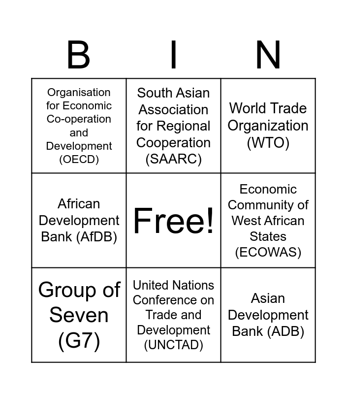 This bingo card has a free space and 15 words: International Monetary Fund (IMF), World Bank, World Trade Organization (WTO), Organisation for Economic Co-operation and Development (OECD), United Nations Conference on Trade and Development (UNCTAD), Asian Development Bank (ADB), European Central Bank (ECB), International Labour Organization (ILO), Economic Community of West African States (ECOWAS), Mercosur (Southern Common Market), G20 (Group of Twenty), African Development Bank (AfDB), Group of Seven (G7), South Asian Association for Regional Cooperation (SAARC) and Latin American Free Trade Association (ALADI).