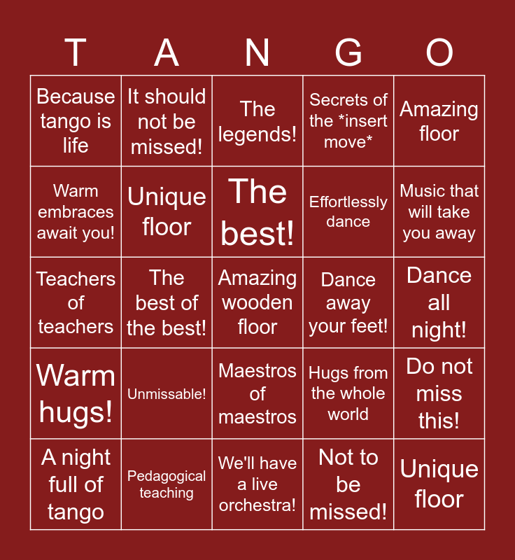 This bingo card has a free space and 24 words: Unmissable!, Pedagogical teaching, The best!, A night full of tango, Amazing floor, Because tango is life, Warm embraces await you!, It should not be missed!, Dance away your feet!, Maestros of maestros, Effortlessly dance, Teachers of teachers, Hugs from the whole world, Do not miss this!, Unique floor, Not to be missed!, Dance all night!, The legends!, Music that will take you away, The best of the best!, Unique floor, Warm hugs!, Secrets of the *insert move* and We'll have a live orchestra!.