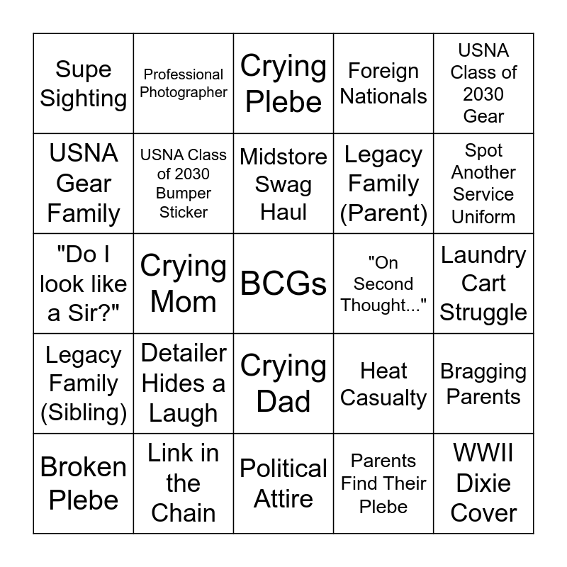 This bingo card has a free space and 31 words: Political Attire, Motivated Plebe, Crying Mom, Napping on Grounds, Supe Sighting, Crying Plebe, USNA Class of 2030 Bumper Sticker, Heat Casualty, "On Second Thought...", Parents Find Their Plebe, Laundry Cart Struggle, WWII Dixie Cover, Messed up Nametag, Token Girlfriend, Spot Another Service Uniform, Dant Sighting, Bragging Parents, Detailer Hides a Laugh, Legacy Family (Sibling), Crying Dad, USNA Class of 2030 Gear, Plebe Falls, Broken Plebe, Professional Photographer, Legacy Family (Parent), USNA Gear Family, Foreign Nationals, "Do I look like a Sir?", Link in the Chain, Midstore Swag Haul and Home-made Signs.