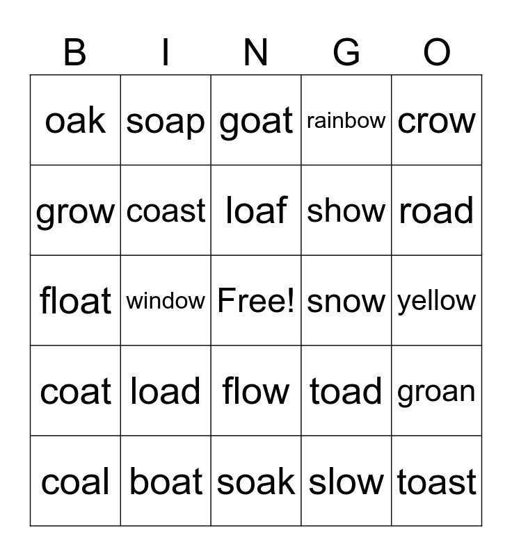 This bingo card has a free space and 24 words: load, boat, loaf, coal, crow, oak, grow, soap, snow, flow, show, float, toad, groan, coast, slow, yellow, goat, road, window, toast, coat, rainbow and soak.