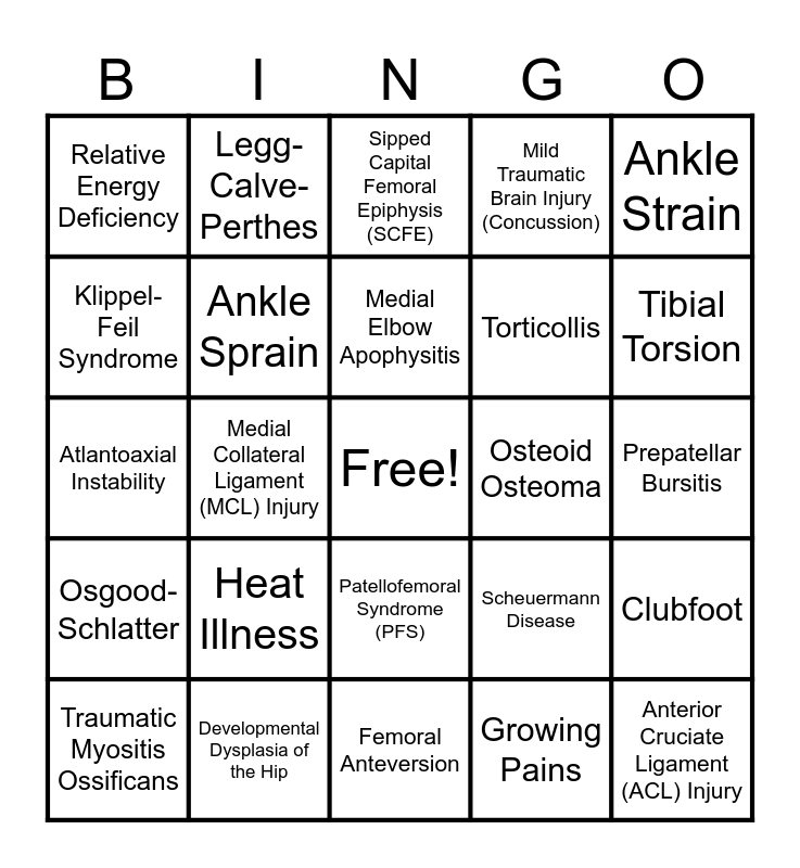 This bingo card has a free space and 28 words: Clubfoot, Scoliosis, Torticollis, Growing Pains, Klippel-Feil Syndrome, Sipped Capital Femoral Epiphysis (SCFE), Legg-Calve-Perthes, Osgood-Schlatter, Osteoid Osteoma, Traumatic Myositis Ossificans, Atlantoaxial Instability, Mild Traumatic Brain Injury (Concussion), Developmental Dysplasia of the Hip, Femoral Anteversion, Tibial Torsion, Kyphosis, Heat Illness, Ankle Sprain, Medial Elbow Apophysitis, Patellofemoral Syndrome (PFS), Relative Energy Deficiency, Patellar Dislocation, Anterior Cruciate Ligament (ACL) Injury, Medial Collateral Ligament (MCL) Injury, Prepatellar Bursitis, Scheuermann Disease, Ankle Strain and Acromioclavicular Separation.