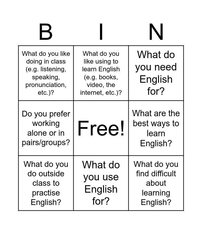 This bingo card has a free space and 8 words: What are the best ways to learn English?, What do you need English for?, What do you like using to learn English (e.g. books, video, the internet, etc.)?, What do you do outside class to practise English?, What do you like doing in class (e.g. listening, speaking, pronunciation, etc.)?, What do you find difficult about learning English?, Do you prefer working alone or in pairs/groups? and What do you use English for?.