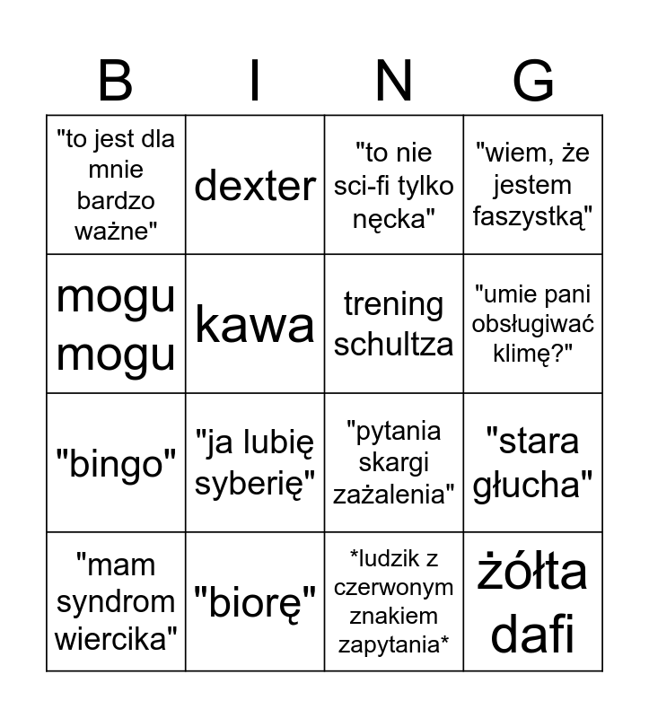 This bingo card has 16 words: "biorę", "stara głucha", "to nie sci-fi tylko nęcka", "to jest dla mnie bardzo ważne", "bingo", dexter, "pytania skargi zażalenia", *ludzik z czerwonym znakiem zapytania*, mogu mogu, kawa, "mam syndrom wiercika", "wiem, że jestem faszystką", "ja lubię syberię", "umie pani obsługiwać klimę?", trening schultza and żółta dafi.